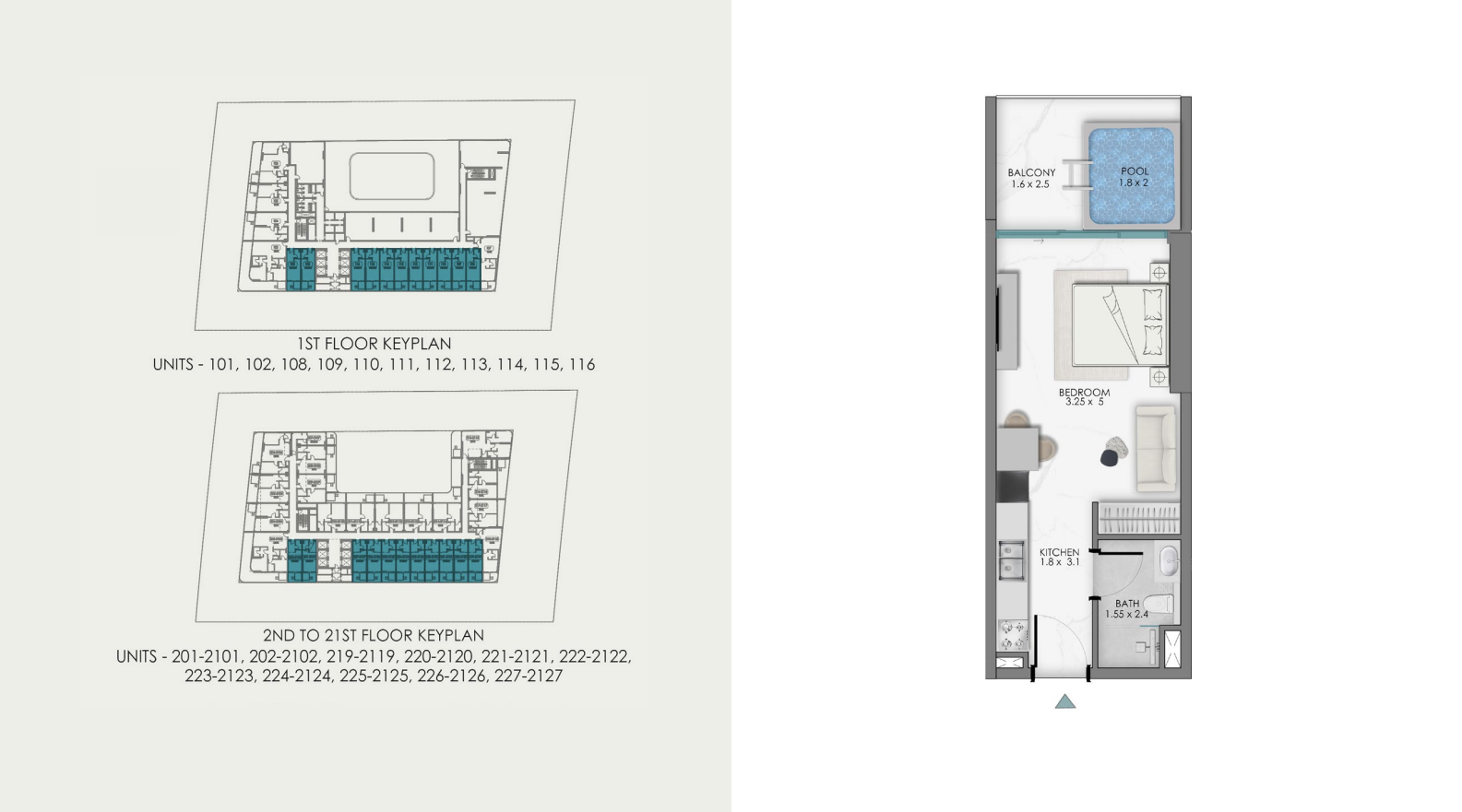 • Piscina privada en la terraza: 1,6 x 2,5 m (exclusiva para cada unidad)